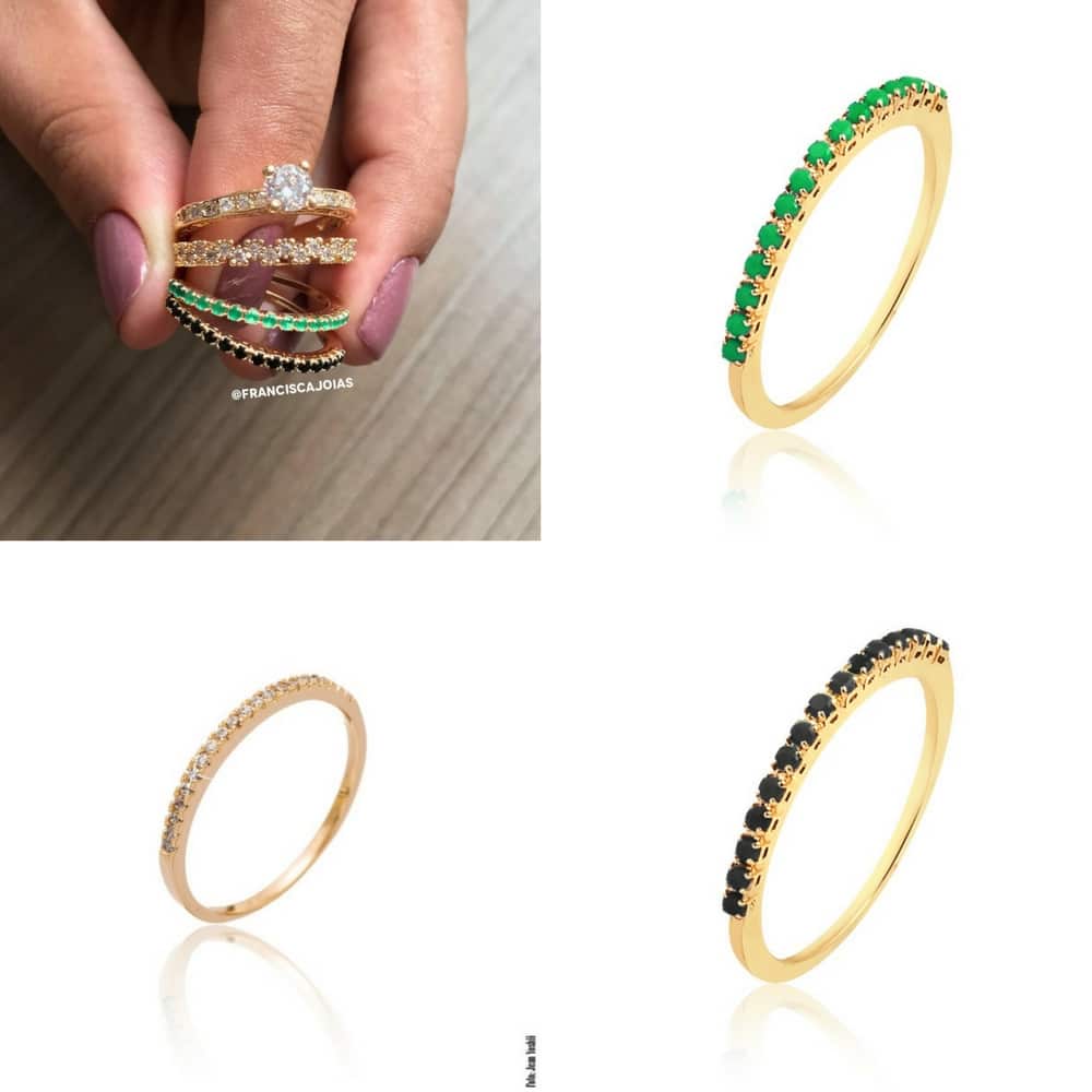 Esse mix, com esses anéis coloridos, dá um toque divertido à combinação. Os anéis verde e preto deixam a combinação maravilhosa. As peças com zircônia são incríveis. Ah, quer saber como cuidar das suas peças de zircônia? Veja aqui um post bem legal sobre isso.