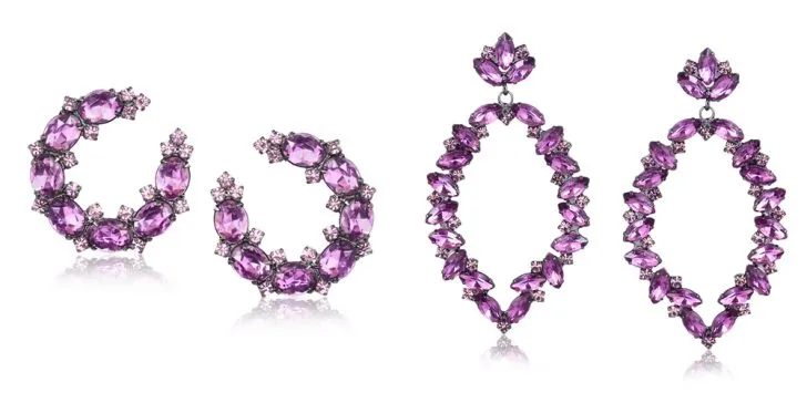 Acima temos duas opções com a cor do ano elegida pela Pantone: violeta. Brinco meia lua com cristais violeta folheado em ródio negro e maxi brinco gota grande com cristais violeta folheado em ródio negro.