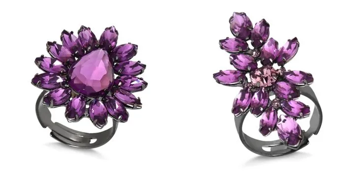 Essa coleção esta repleta de tendências, seja na escolha das cores, das pedras e até dos tamanhos e formatos dos acessórios. Temos opções de anéis para fazer par com os brincos violeta: anel gota regulável com cristais violeta folheado em ródio negro e anel flor regulável com cristais violeta folheado em ródio negro.