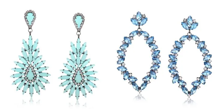 Decidimos apostar em cores diversas para essa coleção, para que as opções se encaixem nas diversidades de gostos e estilos, mas todas as joias são especialmente únicas e cheias de luxo. Acima opções em azul, Maxi brinco espinha de peixe com cristais azul claro leitoso folheado em ródio negro e maxi brinco gota grande com cristais azul claro folheado em ródio negro.